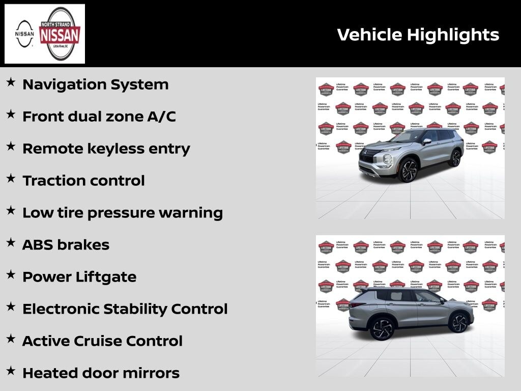 CARFAX One-Owner. Clean CARFAX. ABS brakes, Active Cruise Control, Alloy wheels, Electronic Stability Control, Front dual zone A/C, Heated door mirrors, Heated Front Bucket Seats, Heated front seats, Illuminated entry, Low tire pressure warning, Navigation System, Power Liftgate, Remote keyless entry, Traction control. 24/31 City/Highway MPG Alloy Silver Metallic 2024 Mitsubishi Outlander SE FWD 2.5L 4-Cylinder DOHC