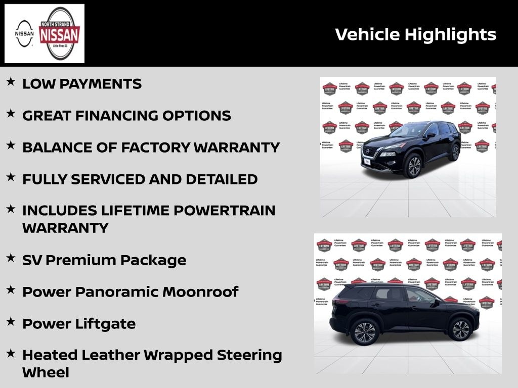 CARFAX One-Owner. LOW PAYMENTS, GREAT FINANCING OPTIONS, BALANCE OF FACTORY WARRANTY, FULLY SERVICED AND DETAILED, INCLUDES LIFETIME POWERTRAIN WARRANTY, Heated Driver & Front Passenger Seats, Heated Leather Wrapped Steering Wheel, Leatherette Door Trim Inserts w/Stitch, Power Liftgate, Power Panoramic Moonroof, PRIMATEX Leatherette Seat Trim, Rear Door Sunshades, Rear Personal Lights, Silver Painted Roof Rails, SV Premium Package. 28/35 City/Highway MPG Super Black 2022 Nissan Rogue SV AWD 1.5L I3 Turbocharged DOHC 12V LEV3-ULEV50 201hp